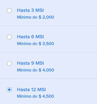 | Meses sin intereses | Monto mínimo aproximado 3 meses $2,000 MXN | 6 meses $3,500 MXN | 9 meses $4,000 MXN | 12 meses $4,500 MXN |